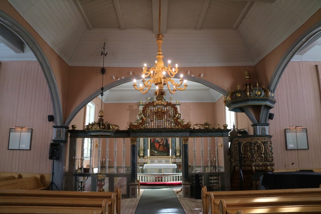 The church was consecrated in 1782, and its interior is ornately decorated. Peder Aadnes painted in Roccoco style and he had elements of the traditional Norwegian rosemaling (rose-painting). One carving style was Roccaille, originating in France, with the use of curves and ornamentation with pebbles and seashells. It is believed that Hans might have picked up this style from craftsmen who came from Christiania, or from visiting the city himself.