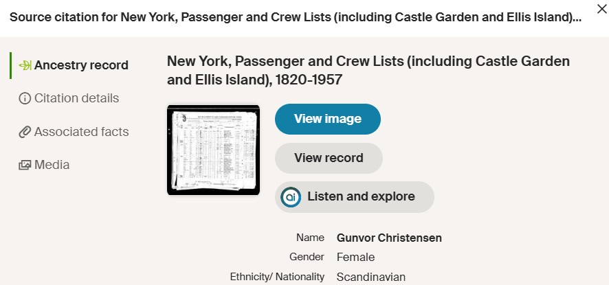 You can listen to Gunvor’s story: A Scandinavian Journey to New York, made by Ancestry’s AI feature Listen and Explore here: