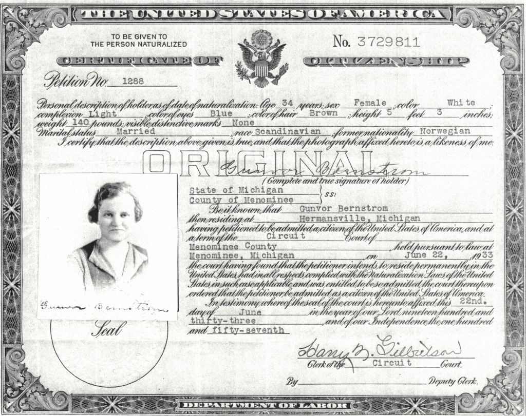 In 1933 Gunvor received her Certificate of U.S. Citizenship. The couple then lived in Hermansville, Michigan, which is in Michigan’s Upper Peninsula.